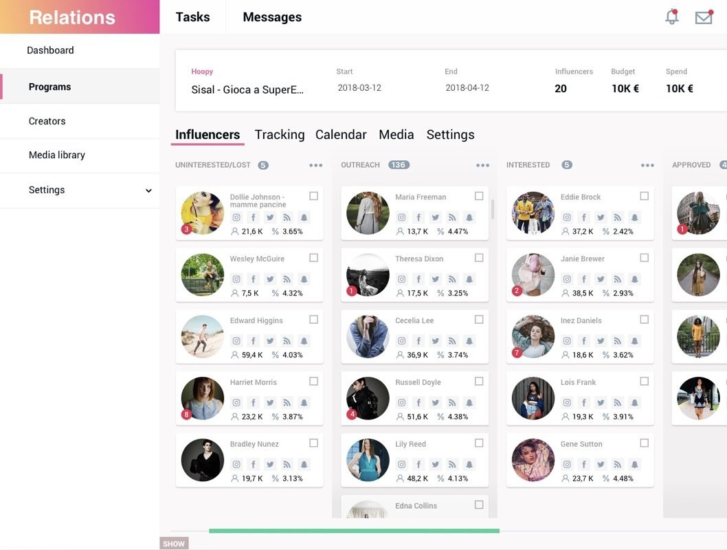 Costruisci il tuo network di brand ambassador con Relations™. Crea programmi influencer, analizza le performance relative e lavora efficientemente su più partnership. Dal singolo post all'intera campagna, con una visione sempre chiara.